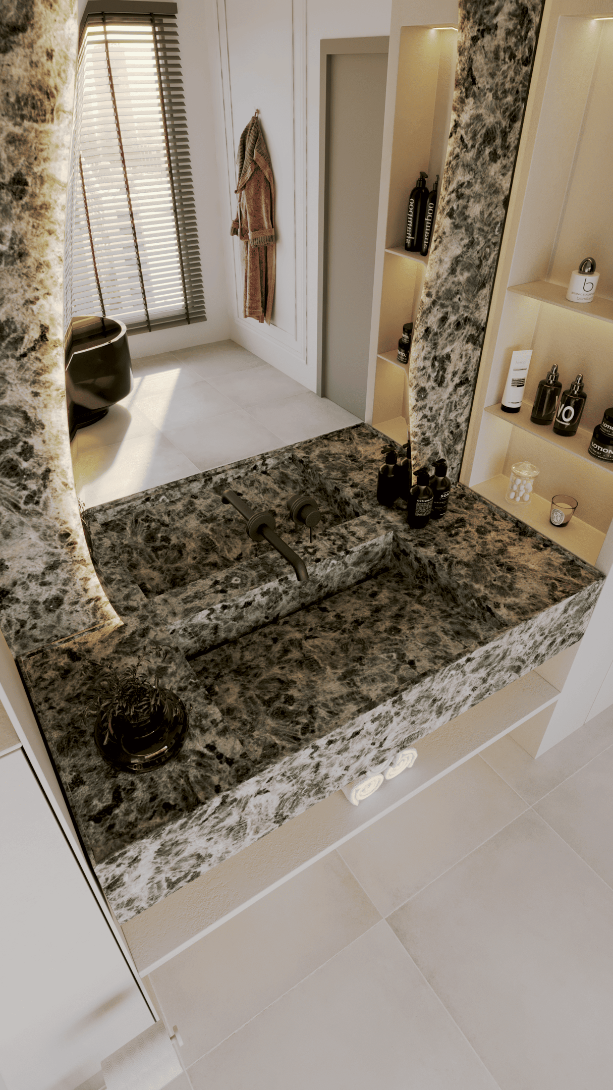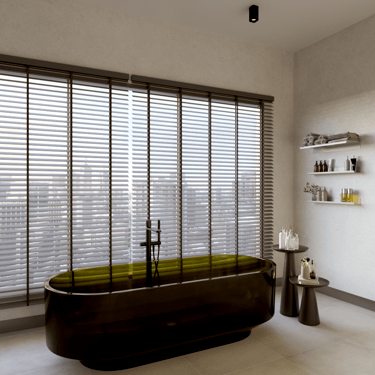 Bu projedeki tasarımın kilit unsurlarından biri de ışığı bir yapı malzemesi gibi kullanmaktı. Geniş pencerede kullanılan ahşap jaluziler, gün ışığını kontrollü bir şekilde içeri alırken, ritmik gölge oyunları yaratıyor. Bu gölgeler, mekana derinlik ve dramatik bir hava katarak misafirlere huzurlu bir arınma deneyimi sunuyor. Işığın bu şekilde yönetimi, mekanın atmosferini günün farklı saatlerinde değiştiriyor.