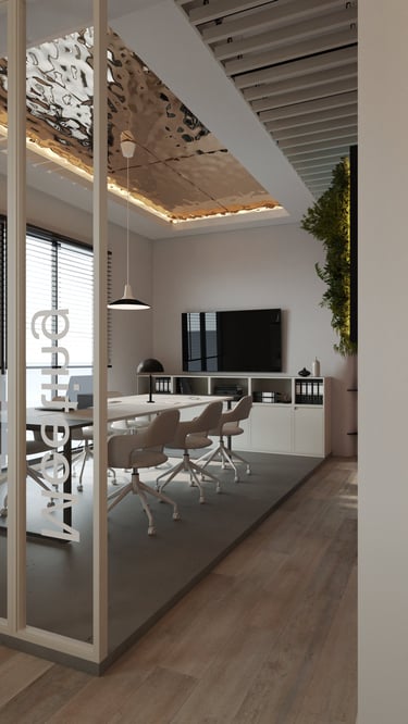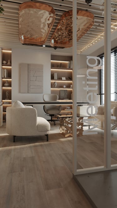 Gayrimenkul ve mimarlık sektörlerinin en büyük temeli "güven"dir. Görseldeki cam bölmeli "Meeting" (Toplantı) odası bu şeffaflık felsefesinin fiziksel bir yansımasıdır. Mekanlar arası görsel temasın kesilmemesi, markanın müşterilerine karşı açık ve şeffaf duruşunu sembolize eder.